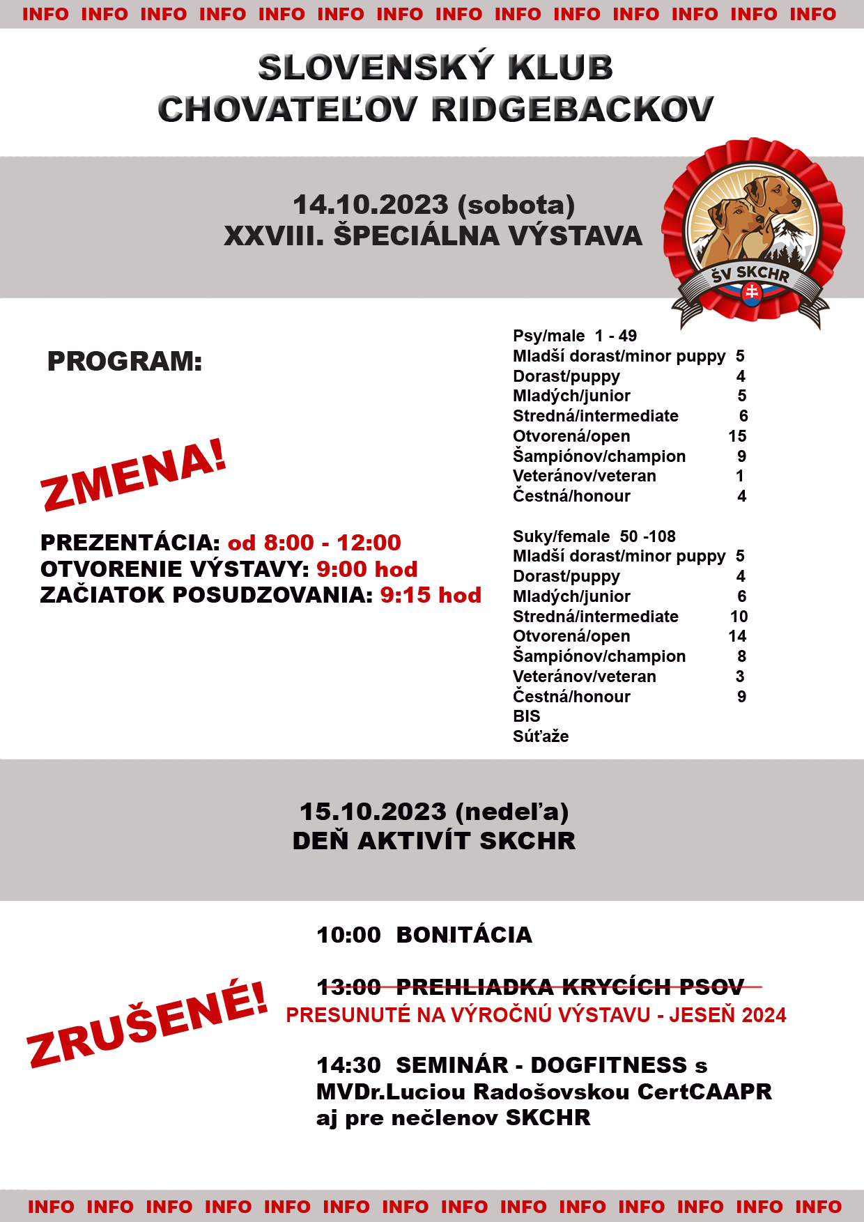 V priloženom letáčiku sú červeným vyznačené zmeny. /otvorenie výstavy o 9:00 hod, začiatok posudzovania 9:15 hod, presunutie prehliadky krycích psov/