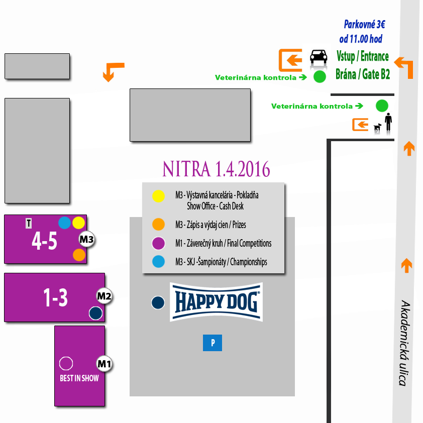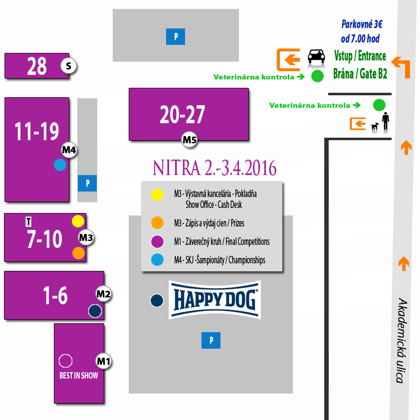 Ak sa chystáte 1., 2. a 3.apríla 2016 do Nitry, prinášame Vám zopár užitočných údajov. Návratku na výstavu nájdete po online prihlásení do Vášho menu na www.dogshow.sk. Vstup na nitrianske výstavisko bude bránou B2 z Akademickej ulice. Na výstavisku prebieha súčasne aj iná výstava, pre ktorú je vyhradené parkovisko P10 a jeho okolie, s parkovným 4,-€.